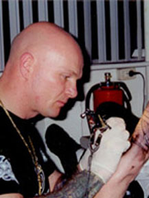 Dit is Bart Gijsbers (10-05-76), heeft in 1992 zijn eerste tatoeage nog bij ons laten zetten! Maar is per 1 januari 2008 (free-lance) bij ons werkzaam. Bart is gespecialiseerd in de grote stukken, o.a. Japans, Maori, free-hand, covers, uitbreiden en/of opknappen van reeds bestaande tatoeages enz. Ook piercet Bart vanaf 2001 en is gespecialiseerd in het stretchen van oorlellen en uit eten gaan.